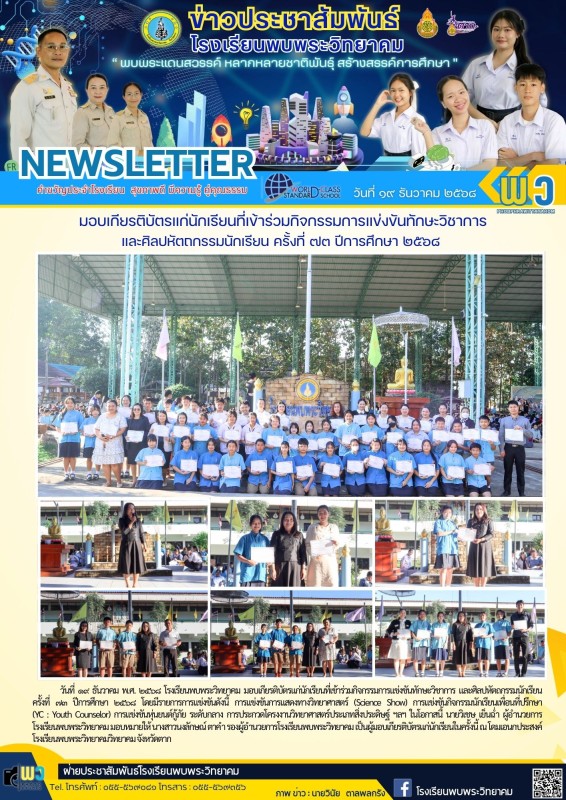 วันที่ ๑๙ ธันวาคม พ.ศ. ๒๕๖๘ โรงเรียนพบพระวิทยาคม มอบเกียรติบัตรแก่นักเรียนที่เข้าร่วมกิจกรรมการแข่งขันทักษะวิชาการ และศิลปหัตถกรรมนักเรียนครั้งที่ ๗๓ ปีการศึกษา ๒๕๖๘ โดยมีรายการการแข่งขันดังนี้ การแข่งขันการแสดงทางวิทยาศาสตร์ (Science Show) การแข่งขันกิจกรรมนักเรียนเพื่อนที่ปรึกษา (YC : Youth Counselor) การแข่งขันหุ่นยนต์กู้ภัย ระดับกลาง การประกวดโครงงานวิทยาศาสตร์ประเภทสิ่งประดิษฐ์ ฯลฯ ในโอกาสนี้ นายวิเชษ เย็นฉ่ำ ผู้อำนวยการโรงเรียนพบพระวิทยาคม มอบหมายให้ นางสาวนงลักษณ์ ตาคำ รองผู้อำนวยการโรงเรียนพบพระวิทยาคม เป็นผู้มอบเกียรติบัตรแก่นักเรียนในครั้งนี้ ณ โดมเอนกประสงค์ โรงเรียนพบพระวิทยาคมวิทยาคม จังหวัดตาก |