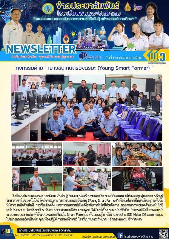 วันที่ ๒๐ ธันวาคม ๒๕๖๘ นายวิเชษ เย็นฉ่ำ ผู้อํานวยการโรงเรียนพบพระวิทยาคม ได้มอบหมายให้คณะครูกลุ่มสาระการเรียนรู้วิทยาศาสตร์และเทคโนโลยี จัดกิจกรรมค่าย "เยาวชนเกษตรอัจฉริยะ (Young Smart Farmer)" เพื่อเปิดโอกาสให้นักเรียนทุกระดับชั้นที่มีความสนใจด้านไอที การเขียนโคดดิ้ง และการเกษตรสมัยใหม่ที่อาศัยเทคโนโลยีช่วยจัดการ ตลอดจนการต่อยอดด้านเทคโนโลยี ต่อไปในอนาคต โดยมีนายนิกร จันตา นายกเทศมนตรีตำบลพบพระ ให้เกียรติเป็นประธานในพิธีเปิด กิจกรรมมีดังนี้ การแนะนำระบบ microcontroller ที่ใช้ระบบสมองกลฝังตัวใน Smart Farm เบื้องต้น , เรียนรู้ การใช้งาน Arduino IDE, Kbide IDE และการเขียนโปรแกรมลงบอร์ดชนิดต่าง ๆ ณ ห้องปฏิบัติการคอมพิวเตอร์ โรงเรียนพบพระวิทยาคม อำเภอพบพระ จังหวัดตาก |