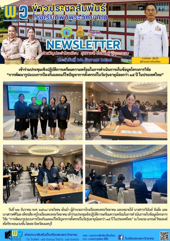 วันที่ ๒๒ ธันวาคม พ.ศ. ๒๕๖๘ นายวิเชษ เย็นฉ่ำ ผู้อำนวยการโรงเรียนพบพระวิทยาคม มอบหมายให้ นางสาวรวินันท์ จันต๊ะ และนางสาวศศิวิมล เพ็ชรเสือ ครูโรงเรียนพบพระวิทยาคม เข้าร่วมประชุมเชิงปฏิบัติการเตรียมความพร้อมในการดำเนินการเก็บข้อมูลโครงการวิจัย “การพัฒนารูปแบบการป้องกันและแก้ไขปัญหาการตั้งครรภ์ในวัยรุ่นอายุน้อยกว่า ๑๕ ปี ในประเทศไทย” ณ โรงแรม แกรนด์ ริชมอนด์ สไตริช คอนเวนชั่น โฮเทล จังหวัดนนทบุรี |