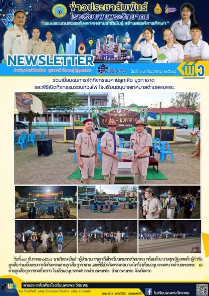 วันที่ ๑๙ ธันวาคม ๒๕๖๘ นายวิเชษ เย็นฉ่ำ ผู้อำนวยการลูกเสือโรงเรียนพบพระวิทยาคม พร้อมด้วย นายศุภณัฐ ยศหล้า ผู้กำกับลูกเสือ ร่วมเยี่ยมชมการจัดกิจกรรมค่ายลูกเสือ ยุวกาชาด และพิธีเปิดกิจกรรมรอบกองไฟ โรงเรียนอนุบาลเทศบาลตำบลพบพระ ณ ค่ายลูกเสือ ยุวกาชาดชั่วคราว โรงเรียนอนุบาลเทศบาลตำบลพบพระ อำเภอพบพระ จังหวัดตาก |