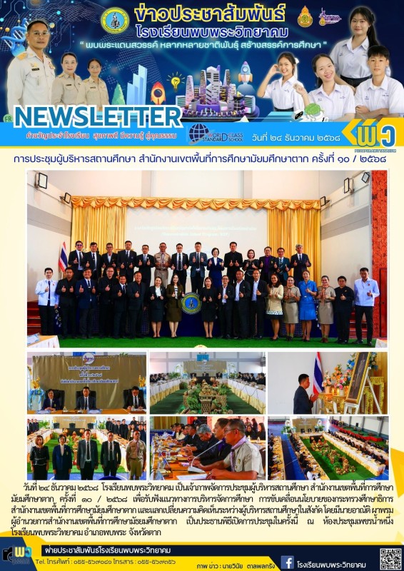 วันที่ ๒๔ ธันวาคม ๒๕๖๘ โรงเรียนพบพระวิทยาคม เป็นเจ้าภาพจัดการประชุมผู้บริหารสถานศึกษา สำนักงานเขตพื้นที่การศึกษามัยมศึกษาตาก ครั้งที่ ๑๐ / ๒๕๖๘ เพื่อรับฟังแนวทางการบริหารจัดการศึกษา การขับเคลื่อนนโยบายของกระทรวงศึกษาธิการ สำนักงานเขตพื้นที่การศึกษามัยมศึกษาตาก และแลกเปลี่ยนความคิดเห็นระหว่างผู้บริหารสถานศึกษาในสังกัด โดยมีนายอาณัติ ผาพรม ผู้อำนวยการสำนักงานเขตพื้นที่การศึกษามัธยมศึกษาตาก เป็นประธานพิธีเปิดการประชุมในครั้งนี้ ณ ห้องประชุมเพชรน้ำหนึ่ง โรงเรียนพบพระวิทยาคม อำเภอพบพระ จังหวัดตาก |