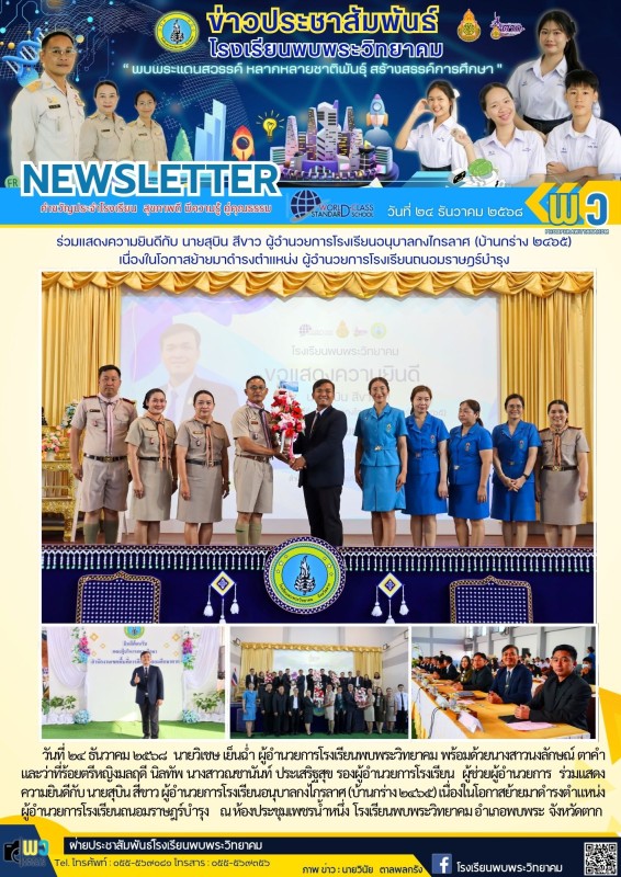 วันที่ ๒๔ ธันวาคม ๒๕๖๘ นายวิเชษ เย็นฉ่ำ ผู้อำนวยการโรงเรียนพบพระวิทยาคม พร้อมด้วยนางสาวนงลักษณ์ ตาคำ และว่าที่ร้อยตรีหญิงมลฤดี นิลทัพ นางสาวณชานันท์ ประเสริฐสุข รองผู้อำนวยการโรงเรียน ผู้ช่วยผู้อำนวยการ ร่วมแสดงความยินดีกับ นายสุบิน สีขาว ผู้อำนวยการโรงเรียนอนุบาลกงไกรลาศ (บ้านกร่าง ๒๔๖๕) เนื่องในโอกาสย้ายมาดำรงตำแหน่ง ผู้อำนวยการโรงเรียนถนอมราษฎร์บำรุง ณ ห้องประชุมเพชรน้ำหนึ่ง โรงเรียนพบพระวิทยาคม อำเภอพบพระ จังหวัดตาก |