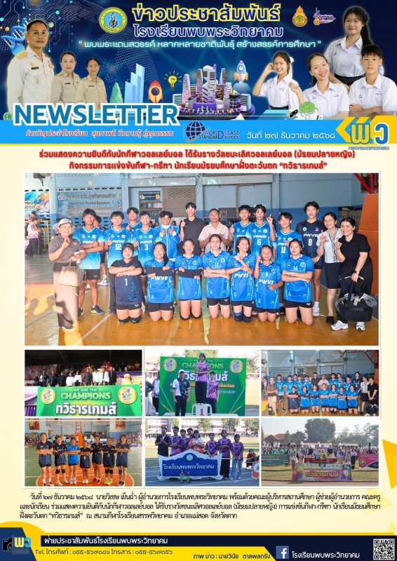 วันที่ ๒๗ ธันวาคม ๒๕๖๘ นายวิเชษ เย็นฉ่ำ ผู้อำนวยการโรงเรียนพบพระวิทยาคม พร้อมด้วยคณะผู้บริหารสถานศึกษา ผู้ช่วยผู้อำนวยการ คณะครู และนักเรียน ร่วมแสดงความยินดีกับนักกีฬาวอลเลย์บอล ได้รับรางวัลชนะเลิศวอลเลย์บอล (มัธยมปลายหญิง) การเเข่งขันกีฬา-กรีฑา นักเรียนมัธยมศึกษาฝั่งตะวันตก “ทวิธารเกมส์” ณ สนามกีฬาโรงเรียนสรรพวิทยาคม อำเภอแม่สอด จังหวัดตาก |