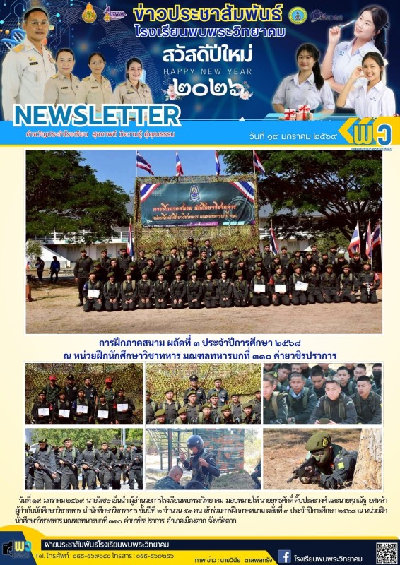 วันที่ ๑๙ มกราคม ๒๕๖๙ นายวิเชษ เย็นฉ่ำ ผู้อำนวยการโรงเรียนพบพระวิทยาคม มอบหมายให้ นายยุทธศักดิ์ ติ๊บปะละวงศ์ และนายศุภณัฐ ยศหล้า ผู้กำกับนักศึกษาวิชาทหาร นำนักศึกษาวิชาทหาร ชั้นปีที่ ๒ จำนวน ๕๑ คน เข้าร่วมการฝึกภาคสนาม ผลัดที่ ๓ ประจำปีการศึกษา ๒๕๖๘ ณ หน่วยฝึกนักศึกษาวิชาทหาร มณฑลทหารบกที่ ๓๑๐ ค่ายวชิรปราการ อำเภอเมืองตาก จังหวัดตาก |