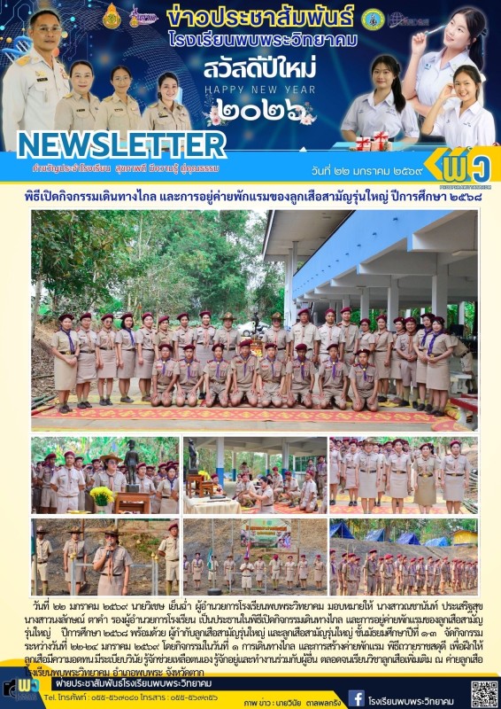 วันที่ ๒๒ มกราคม ๒๕๖๙ นายวิเชษ เย็นฉ่ำ ผู้อำนวยการโรงเรียนพบพระวิทยาคม มอบหมายให้ นางสาวณชานันท์ ประเสริฐสุข นางสาวนงลักษณ์ ตาคำ รองผู้อำนวยการโรงเรียน เป็นประธานในพิธีเปิดกิจกรรมเดินทางไกล และการอยู่ค่ายพักแรมของลูกเสือสามัญ รุ่นใหญ่ ปีการศึกษา ๒๕๖๘ พร้อมด้วย ผู้กำกับลูกเสือสามัญรุ่นใหญ่ และลูกเสือสามัญรุ่นใหญ่ ชั้นมัธยมศึกษาปีที่ ๑-๓ จัดกิจกรรมระหว่างวันที่ ๒๒-๒๔ มกราคม ๒๕๖๙ โดยกิจกรรมในวันที่ ๑ การเดินทางไกล และการสร้างค่ายพักแรม พิธีถวายราชสดุดี เพื่อฝึกให้ลูกเสือมีความอดทน มีระเบียบวินัย รู้จักช่วยเหลือตนเอง รู้จักอยู่และทำงานร่วมกับผู้อื่น ตลอดจนเรียนวิชาลูกเสือเพิ่มเติม ณ ค่ายลูกเสือโรงเรียนพบพระวิทยาคม อำเภอพบพระ จังหวัดตาก |