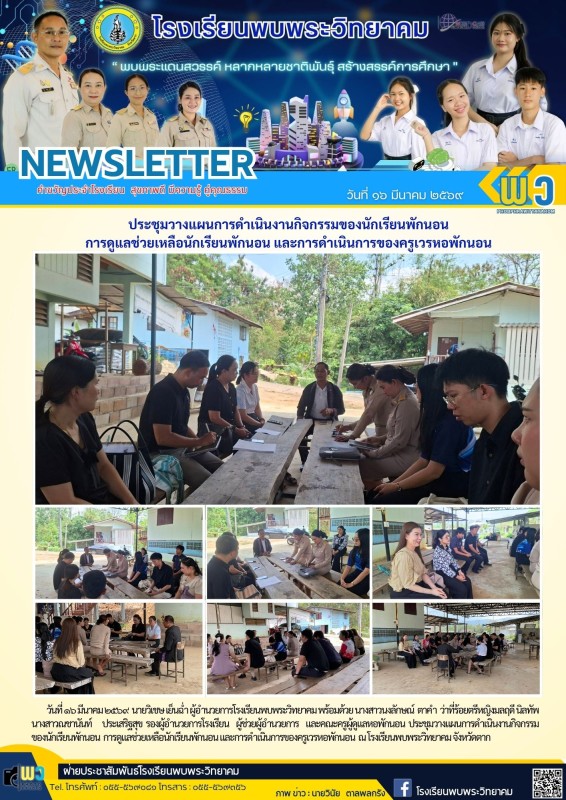 วันที่ ๑๖ มีนาคม ๒๕๖๙ นายวิเชษ เย็นฉ่ำ ผู้อำนวยการโรงเรียนพบพระวิทยาคม พร้อมด้วย นางสาวนงลักษณ์ ตาคำ ว่าที่ร้อยตรีหญิงมลฤดี นิลทัพ นางสาวณชานันท์ ประเสริฐสุข รองผู้อำนวยการโรงเรียน ผู้ช่วยผู้อำนวยการ และคณะครูผู้ดูแลหอพักนอน ประชุมวางแผนการดำเนินงานกิจกรรม ของนักเรียนพักนอน การดูแลช่วยเหลือนักเรียนพักนอน และการดำเนินการของครูเวรหอพักนอน ณ โรงเรียนพบพระวิทยาคม จังหวัดตาก |