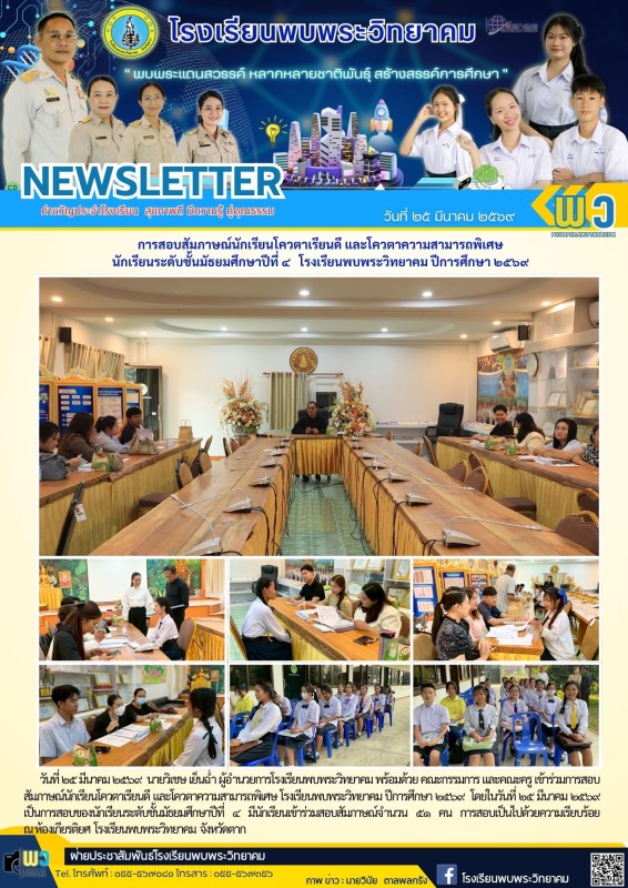 วันที่ ๒๕ มีนาคม ๒๕๖๙ นายวิเชษ เย็นฉ่ำ ผู้อำนวยการโรงเรียนพบพระวิทยาคม พร้อมด้วย คณะกรรมการ และคณะครู เข้าร่วมการสอบสัมภาษณ์นักเรียนโควตาเรียนดี และโควตาความสามารถพิเศษ โรงเรียนพบพระวิทยาคม ปีการศึกษา ๒๕๖๙ โดยในวันที่ ๒๕ มีนาคม ๒๕๖๙ เป็นการสอบของนักเรียนระดับชั้นมัธยมศึกษาปีที่ ๔ มีนักเรียนเข้าร่วมสอบสัมภาษณ์จำนวน ๕๑ คน การสอบเป็นไปด้วยความเรียบร้อย ณ ห้องเกียรติยศ โรงเรียนพบพระวิทยาคม จังหวัดตาก |