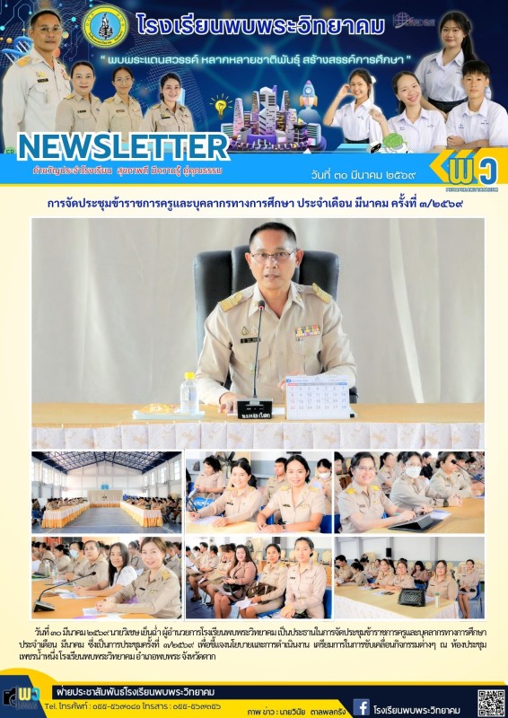 วันที่ ๓๐ มีนาคม ๒๕๖๙ นายวิเชษ เย็นฉ่ำ ผู้อำนวยการโรงเรียนพบพระวิทยาคม เป็นประธานในการจัดประชุมข้าราชการครูและบุคลากรทางการศึกษา ประจำเดือน มีนาคม ซึ่งเป็นการประชุมครั้งที่ ๓/๒๕๖๙ เพื่อชี้แจงนโยบายและการดำเนินงาน เตรียมการในการขับเคลื่อนกิจกรรมต่างๆ ณ ห้องประชุมเพชรน้ำหนึ่ง โรงเรียนพบพระวิทยาคม อำเภอพบพระ จังหวัดตาก |