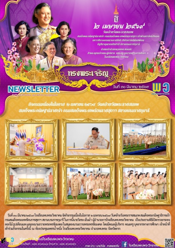 วันที่ ๓๐ มีนาคม ๒๕๖๙ โรงเรียนพบพระวิทยาคม จัดกิจกรรมเนื่องในโอกาส ๒ เมษายน ๒๕๖๙ วันคล้ายวันพระราชสมภพ สมเด็จพระกนิษฐาธิราชเจ้ากรมสมเด็จพระเทพรัตนราชสุดาฯ สยามบรมราชกุมารี ในการนี้นายวิเชษ เย็นฉ่ำ ผู้อำนวยการโรงเรียนพบพระวิทยาคม เป็นประธานพิธีเปิดกรวยกระทงดอกไม้ ธูปเทียนแพ และลงนามถวายพระพรชัยมงคล ในสมุดลงนามถวายพระพรชัยมงคล โดยมีคณะผู้บริหาร คณะครู บุคลากรทางการศึกษา เจ้าหน้าที่ เข้าร่วมกิจกรรมในครั้งนี้ ณ ห้องประชุมเพชรน้ำหนึ่ง โรงเรียนพบพระวิทยาคม อำเภอพบพระ จังหวัดตาก |