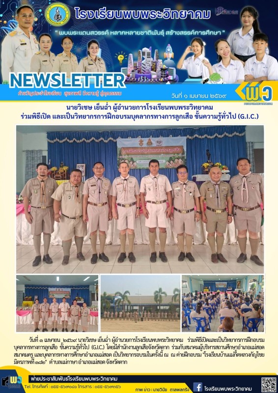 วันที่ ๑ เมษายน ๒๕๖๙ นายวิเชษ เย็นฉ่ำ ผู้อำนวยการโรงเรียนพบพระวิทยาคม ร่วมพิธีเปิดและเป็นวิทยากรการฝึกอบรมบุคลากรทางการลูกเสือ ขั้นความรู้ทั่วไป (G.I.C.) โดยมีสำนักงานลูกเสือจังหวัดตาก ร่วมกับสมาคมผู้บริหารสถานศึกษาอำเภอแม่สอด สมาคมครู และบุคลากรทางการศึกษาอำเภอแม่สอด เป็นวิทยากรอบรมในครั้งนี้ ณ ณ ค่ายฝึกอบรม "โรงเรียนบ้านแม่กื้ดหลวงกัญไชยมิตรภาพที่ ๑๘๒" ตำบลแม่กาษา อำเภอแม่สอด จังหวัดตาก |