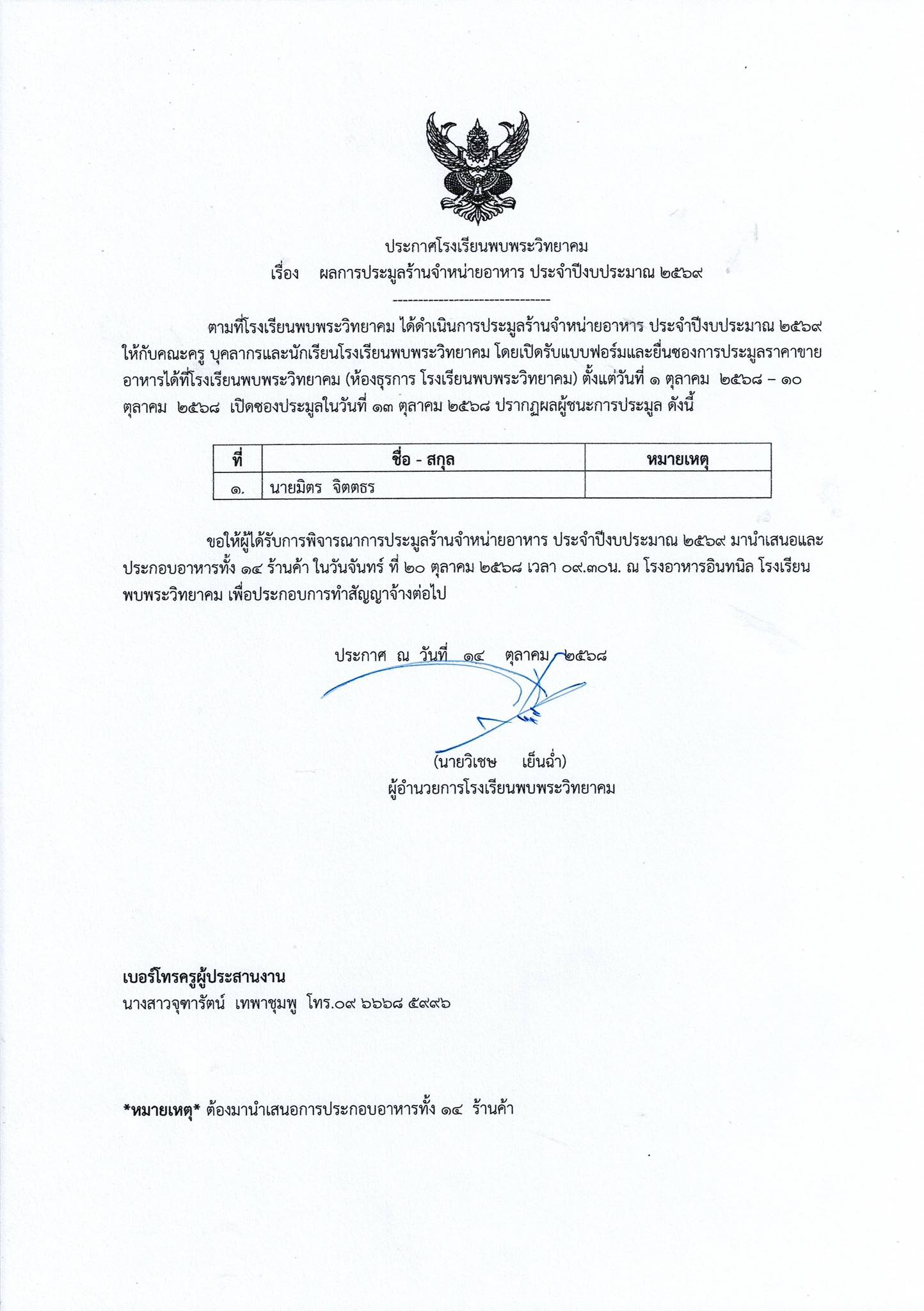 ประกาศโรงเรียนพบพระวิทยาคม? เรื่อง ผลการประมูลร้านจำหน่ายอาหาร ประจำปีงบประมาณ ๒๕๖๙