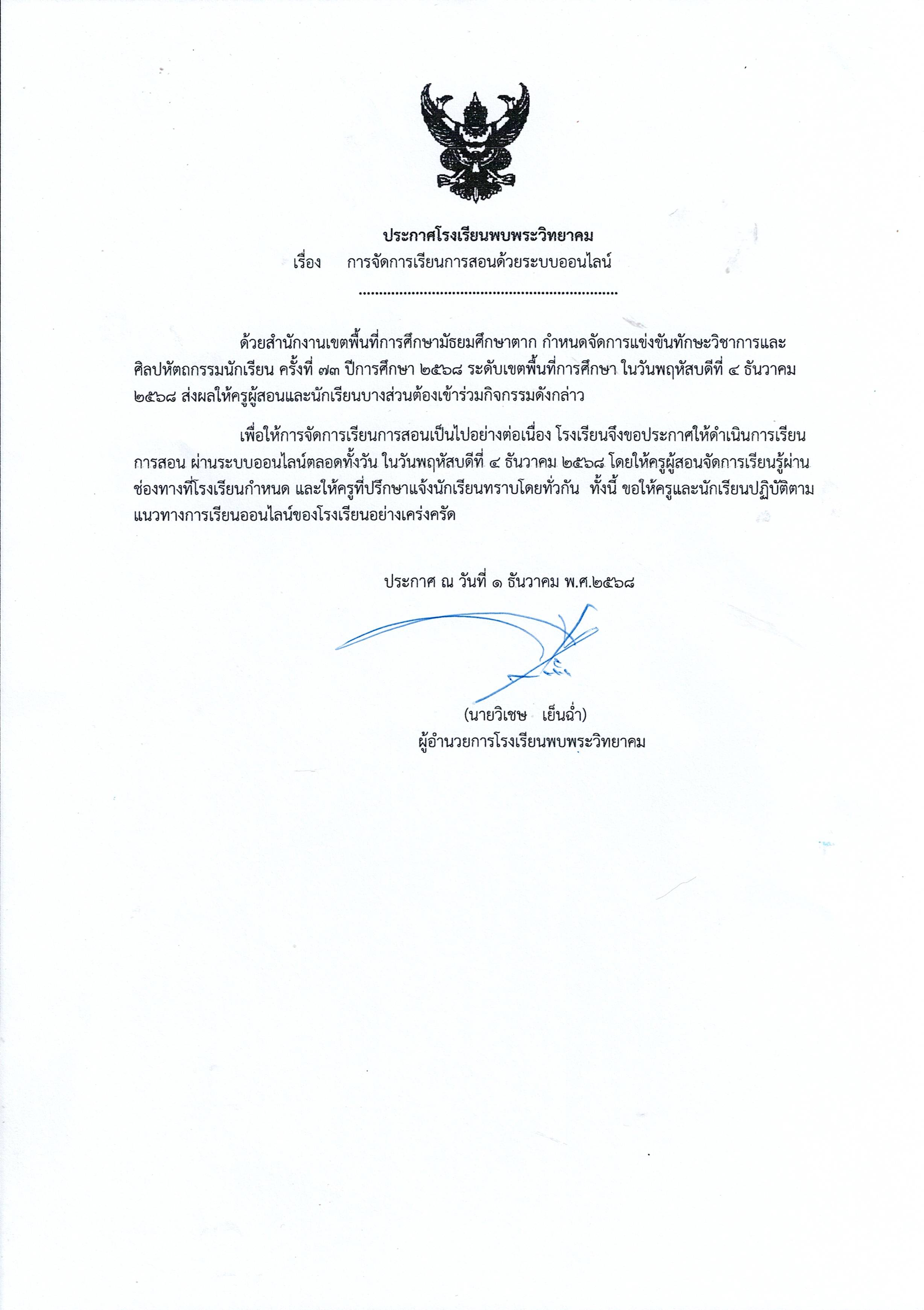 ประกาศโรงเรียนพบพระวิทยาคม เรื่อง การจัดการเรียนการสอนด้วยระบบออนไลน์